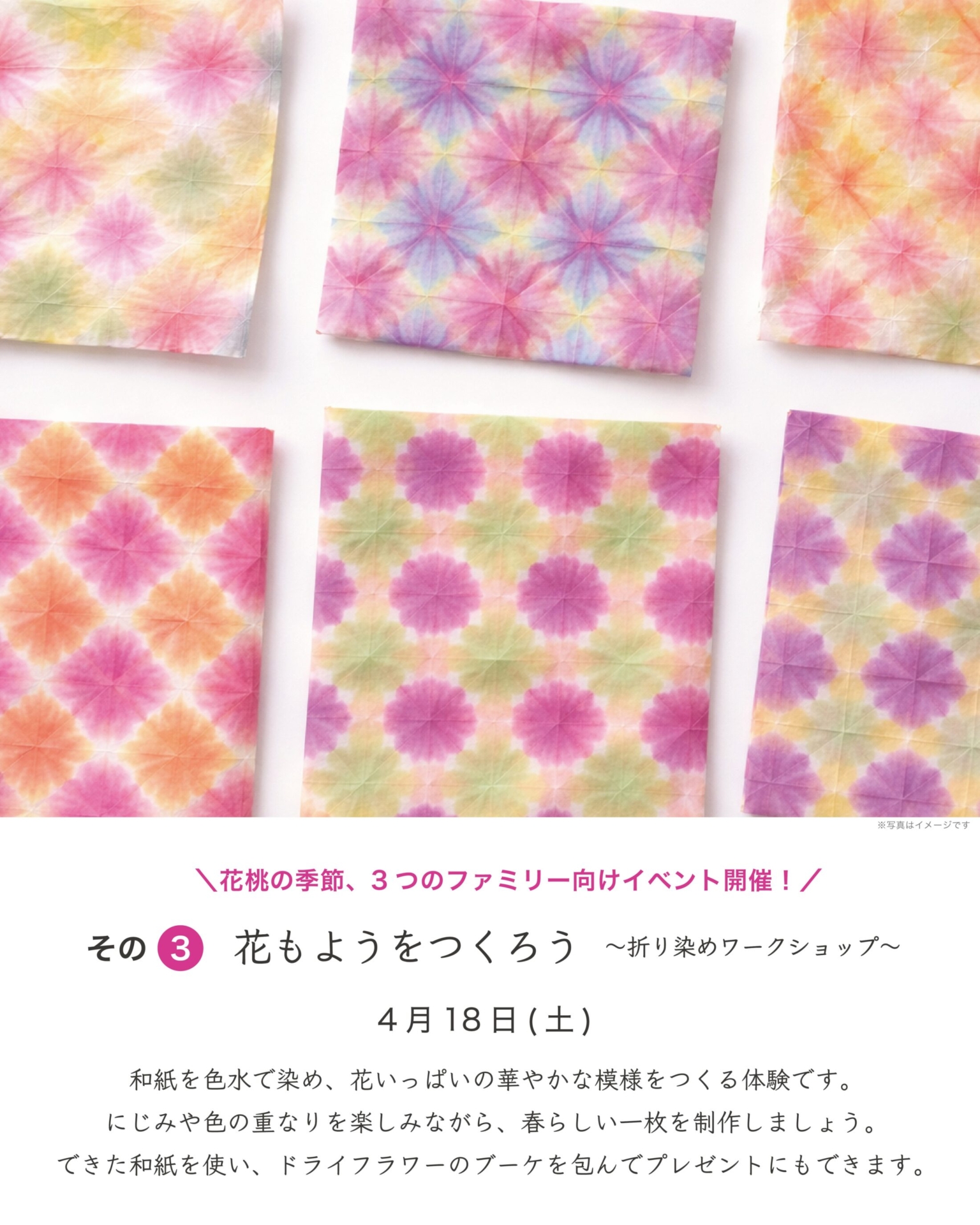 和紙を色水で染め、花いっぱいの華やかな模様をつくる「折り染め」体験を行います。
