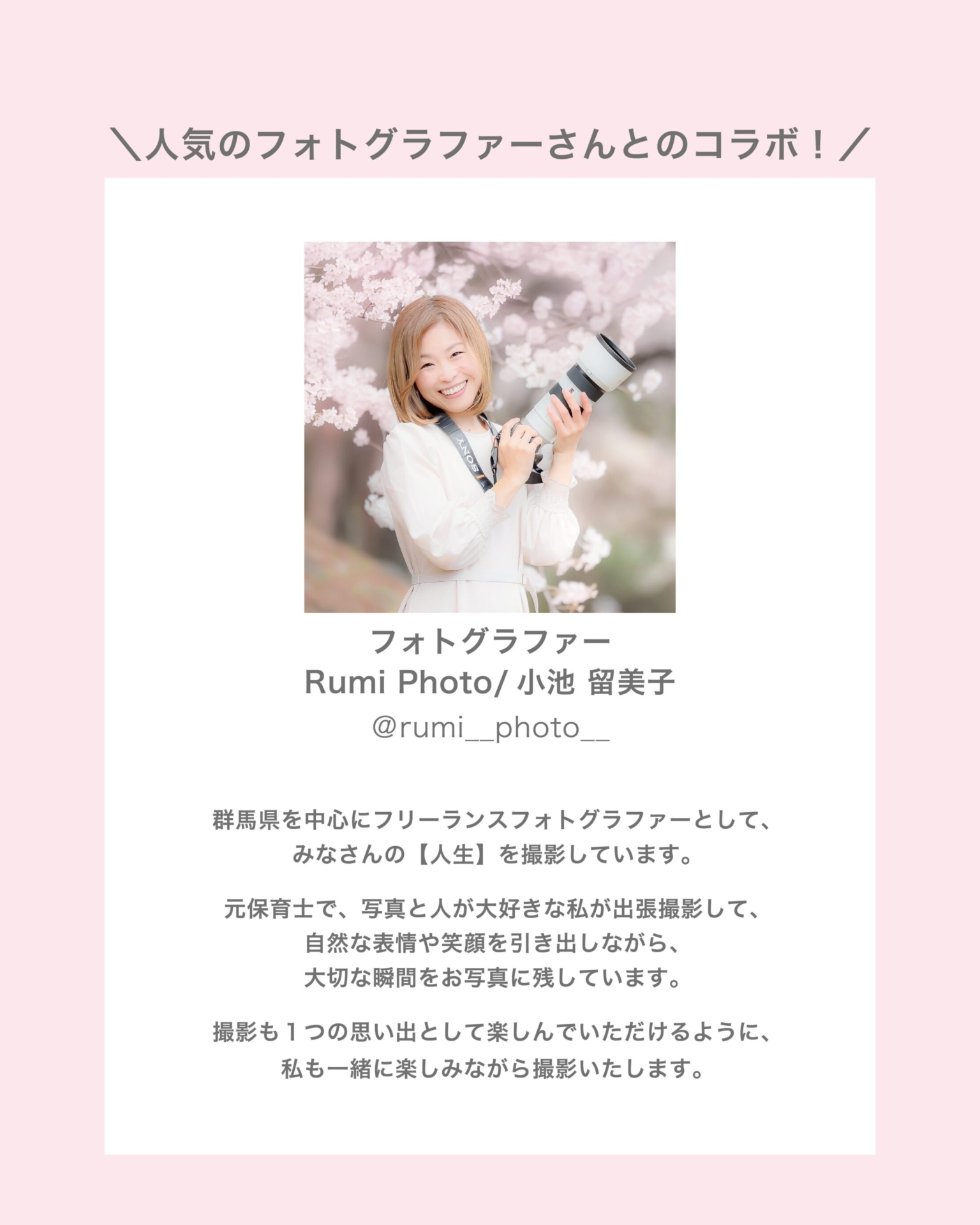 | 納品方法 | Rumi Photo公式LINEよりデータで納品 1枠15枚 / 2枠30枚 ※アルバムやパネルなど、フォトグッズ作成もオプションで可能です。ご相談ください。 |