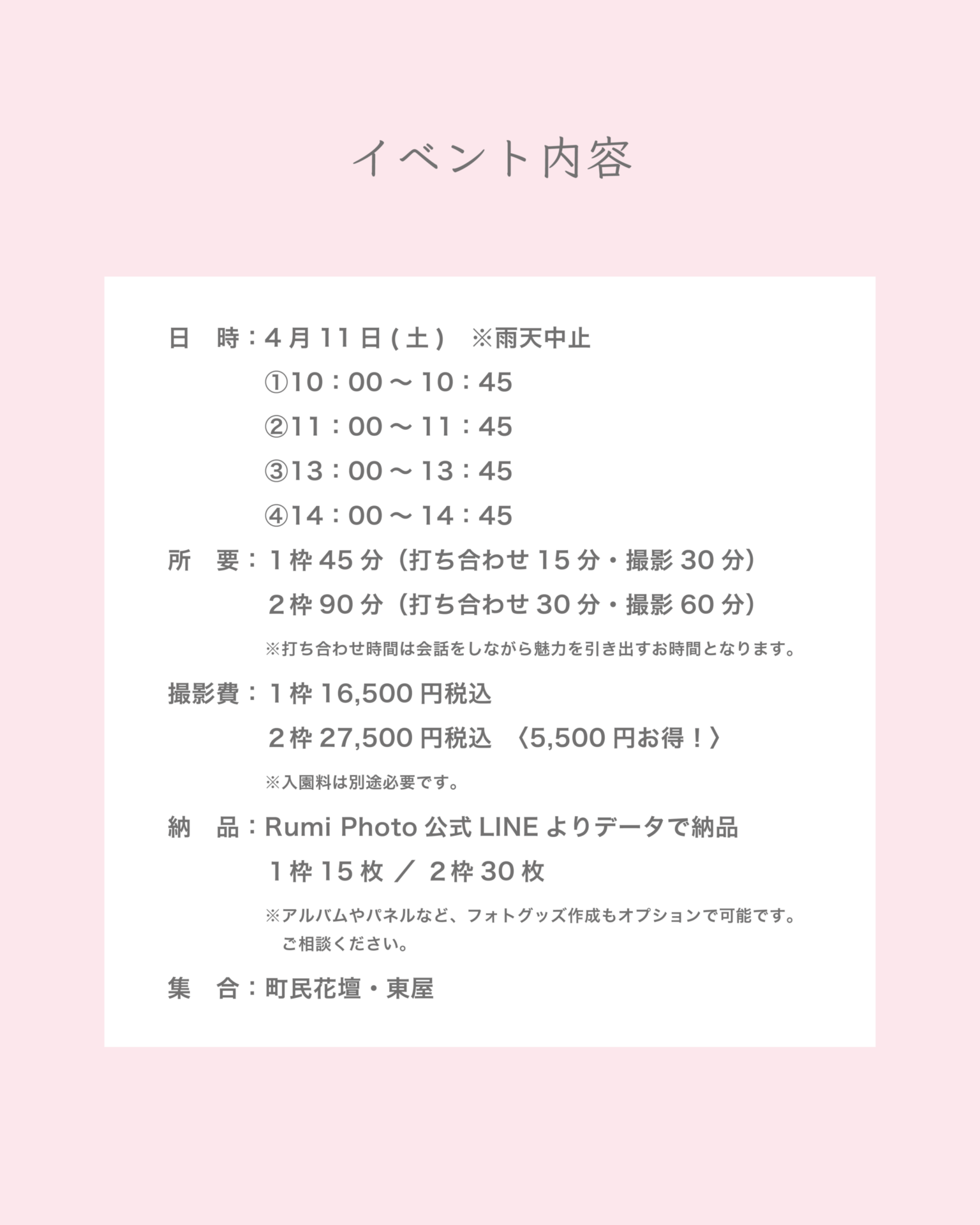 | 注意 | ・投稿画像内のお写真は、全て別のロケーションにて撮影された作例となります。当日は花桃の丘での撮影となります。 ・そのほか画像やインスタグラムにてご確認ください。 |