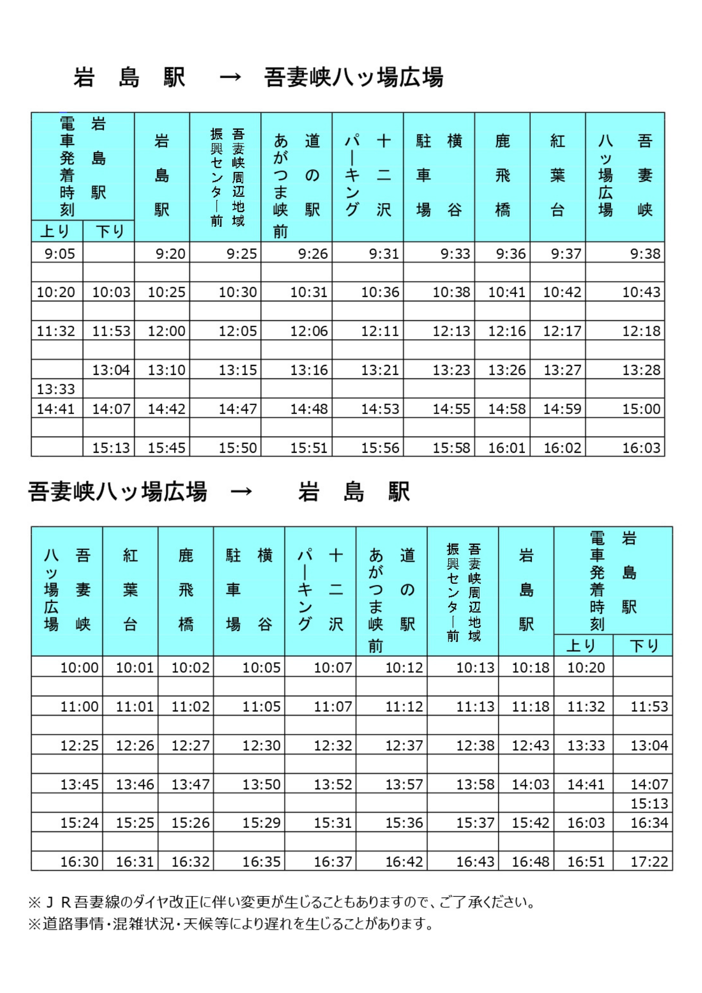 吾妻渓谷を訪れる皆様に魅力ある新緑をよりいっそう堪能していただくため、一般車両通行規制区間となっている吾妻渓谷内(JR岩島駅~吾妻峡八ッ場広場)をめぐるシャトルバスを期間限定で運行します。アガッタンの復路として、また渓谷内をバスで気軽に移動できます。是非ご利用ください。